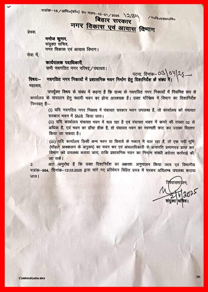 नगर पंचायत मुरौल के कार्यालय संचालन और सरकारी नियमों की अनदेखी को लेकर वार्ड पार्षद आनंद कंद साह ने नगर विकास एवं आवास विभाग के स्पष्ट निर्देशों का हवाला देते हुए प्रशासन को घेरा है। पार्षद आनंद कंद साह ने नगर विकास एवं आवास विभाग की अधिसूचना (पत्रांक 15/अभि०-10-01/2025-1284, दिनांक 03.04.2025) का उल्लेख करते हुए कहा कि सरकारी नियमों के अनुसार, यदि किसी नवगठित नगर निकाय में ‘पंचायत सरकार भवन’ उपलब्ध है, तो कार्यालय को अनिवार्य रूप से उसी भवन में स्थानांतरित किया जाना चाहिए । पार्षद का तर्क है कि विभाग का यह स्पष्ट दिशानिर्देश राजकोषीय अनुशासन सुनिश्चित करने के लिए जारी किया गया था, ताकि सरकारी धन का दुरुपयोग न हो । इसके बावजूद, अधिकारियों द्वारा राज्य सरकार के स्वामित्व वाले उपलब्ध बुनियादी ढांचे (पंचायत सरकार भवन) को छोड़कर निजी किराये के भवन में कार्यालय जारी रखना सरकारी नीतियों की खुली अवहेलना और ‘शक्ति का दुरुपयोग’ है । उन्होंने पुलिस प्रशासन से आग्रह किया है कि “सत्यनारायण पंचायत सरकार भवन, नगर पंचायत मुरौल के कार्यालय के लिए एक आवश्यक एवं महत्वपूर्ण विकल्प है ।