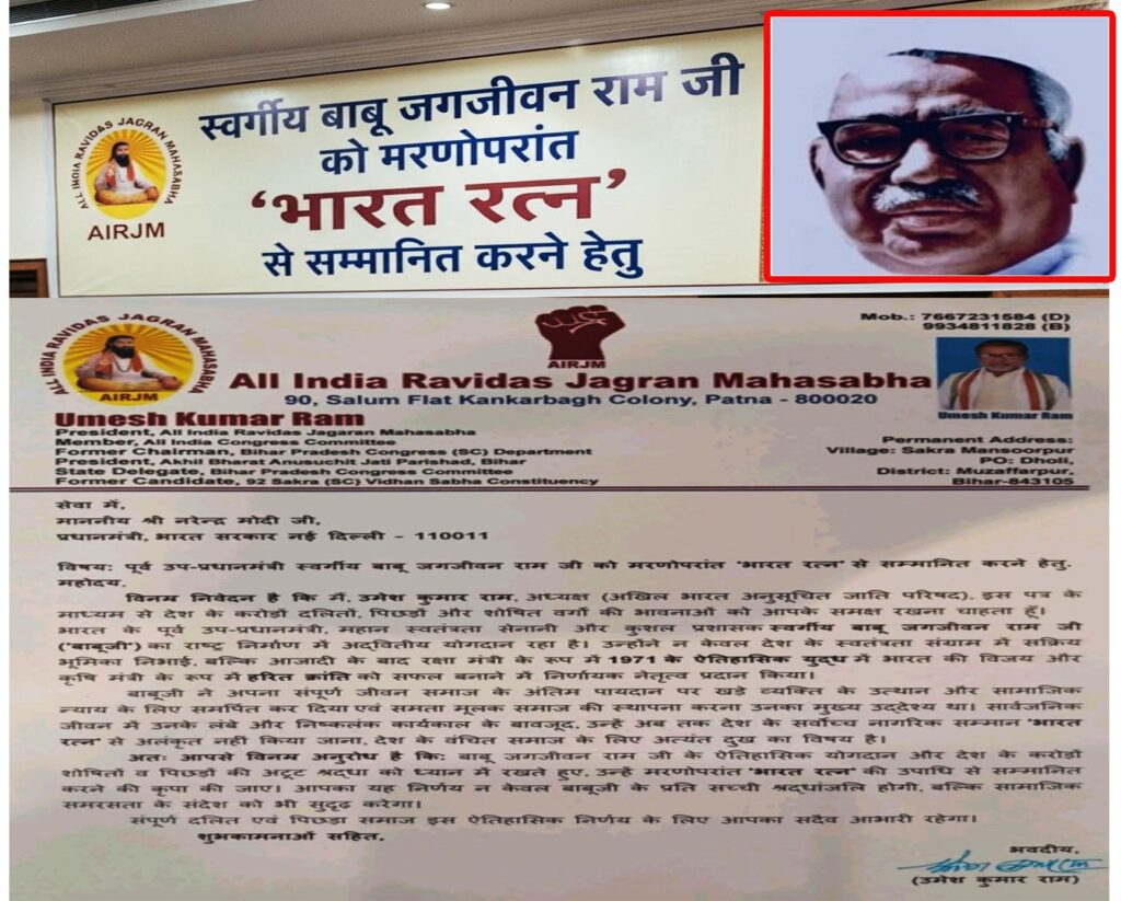 सरकार से ऐतिहासिक निर्णय की अपील अध्यक्ष उमेश कुमार राम ने प्रधानमंत्री से आग्रह किया कि बाबू जगजीवन राम के ऐतिहासिक योगदान और देश के करोड़ों शोषित व पिछड़े वर्गों की अटूट श्रद्धा को ध्यान में रखते हुए, उन्हें मरणोपरांत ‘भारत रत्न’ देने का निर्णय लें। उन्होंने कहा कि यह निर्णय न केवल बाबूजी के प्रति एक सच्ची श्रद्धांजलि होगी, बल्कि यह देश में सामाजिक समरसता के संदेश को भी और अधिक सुदृढ़ करेगा।