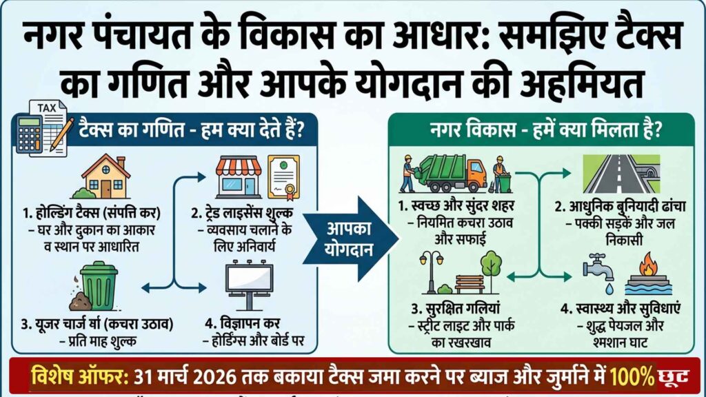कर वसूलने और सुविधा देने का संबंध: नगर पंचायत द्वारा वसूला गया टैक्स एक ‘बीज’ की तरह है। जब आप टैक्स देते हैं, तो नगर पंचायत का ढांचा मजबूत होता है, जिससे: