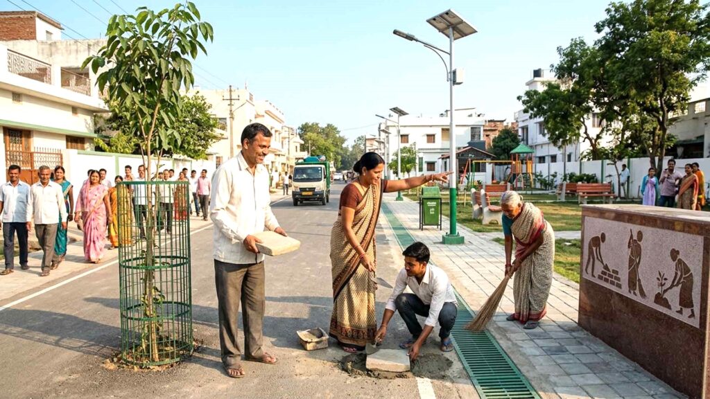 - सॉलिड वेस्ट मैनेजमेंट : घर-घर से कचरा इकट्ठा करना और उसका सही निपटान (डिस्पोजल) करना।