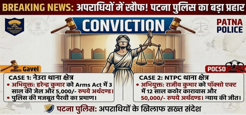 पटना: पटना पुलिस ने कानून व्यवस्था को मजबूत करते हुए अपराधियों के खिलाफ एक बड़ी जीत हासिल की है। पुलिस द्वारा प्रस्तुत ठोस साक्ष्यों और समयबद्ध तरीके से दाखिल की गई चार्जशीट के दम पर, माननीय न्यायालयों ने दो अलग-अलग मामलों में दोषियों को कड़ी सजा सुनाई है। इस कार्रवाई ने स्पष्ट कर दिया है कि पटना में अपराध करने वाले किसी भी हाल में कानून के शिकंजे से बच नहीं पाएंगे।