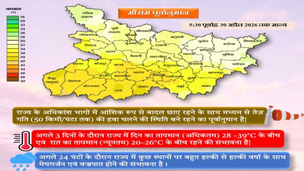50 किमी की रफ्तार से चलेगी हवा मौसम विभाग के ताजा पूर्वानुमान के अनुसार, बिहार के कई इलाकों में मौसम में बड़ा बदलाव देखा जा रहा है। राज्य के अधिकांश हिस्सों में आंशिक रूप से बादल छाए रहेंगे और इस दौरान 50 किलोमीटर प्रति घंटे की रफ्तार से तेज हवाएं चलने की स्थिति बनी हुई है। मौसम विभाग ने आम लोगों से सावधानी बरतने की अपील की है।