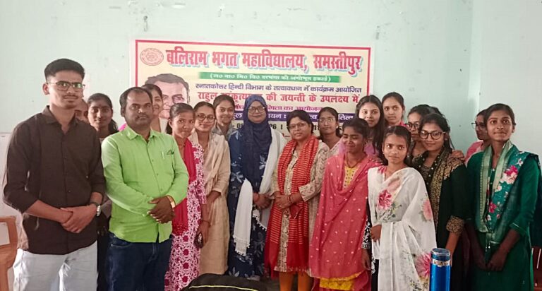 समस्तीपुर | 9 अप्रैल, 2026 स्थानीय बलिराम भगत (बी.आर.बी.) महाविद्यालय के हिंदी विभाग द्वारा बृहस्पतिवार को महापंडित राहुल सांकृत्यायन की जयंती अत्यंत उत्साह और गरिमा के साथ मनाई गई। इस अवसर पर ‘महापंडित राहुल सांकृत्यायन: जीवन, दर्शन और साहित्य’ विषय पर एक विशेष संगोष्ठी का आयोजन किया गया। ज्ञानानुसंधान के प्रतीक थे महापंडित: प्राचार्य संगोष्ठी … Continue reading महापंडित राहुल सांकृत्यायन की जयंती पर बी.आर.बी. कॉलेज में संगोष्ठी: ‘घुमक्कड़ी शास्त्र’ और साहित्यिक योगदान पर चर्चा