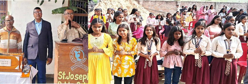 संत जोसेफ स्कूल में कार्यक्रम के दौरान गायन प्रस्‍तुत करती छात्रा एवं  पूजा में तल्‍लीन छात्रगण
